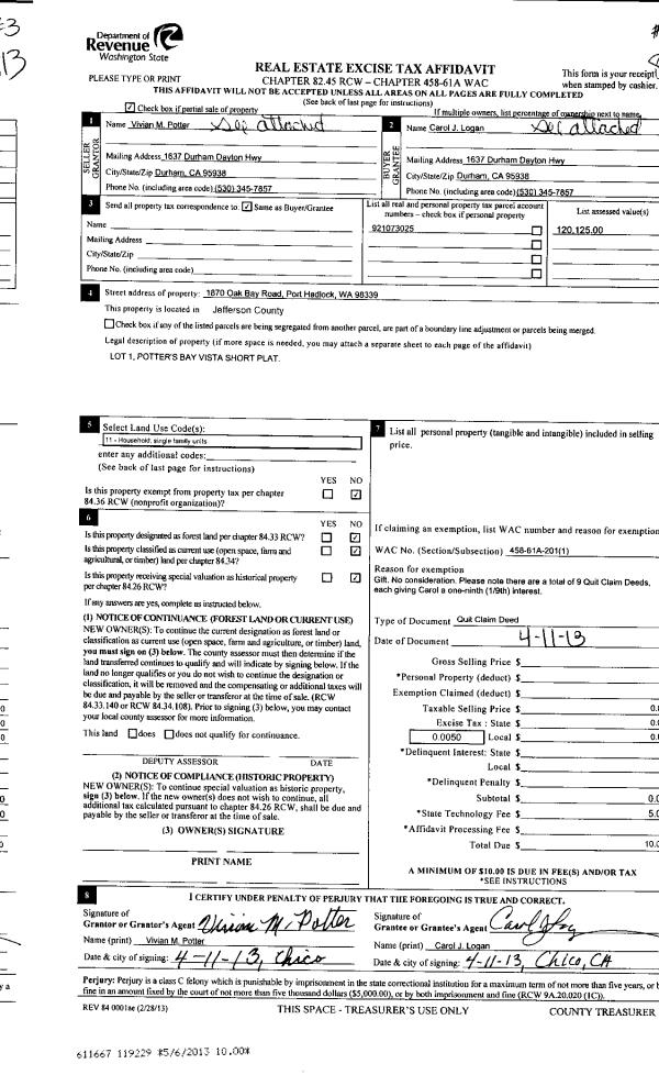 | 11 | 04/11/2013 | QCD | Quit Claim Deed | VIVIAN M POTTER | CAROL J LOGAN | | | | 119229 | |