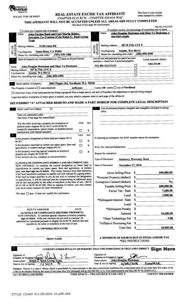 | 2 | 11/27/2018 | SWD | Statutory Warranty Deed | RALPH G RUSH TRUSTEE | JOHN D & SHAN Y HOEKMAN | | | $600,000.00 | 131469 | |