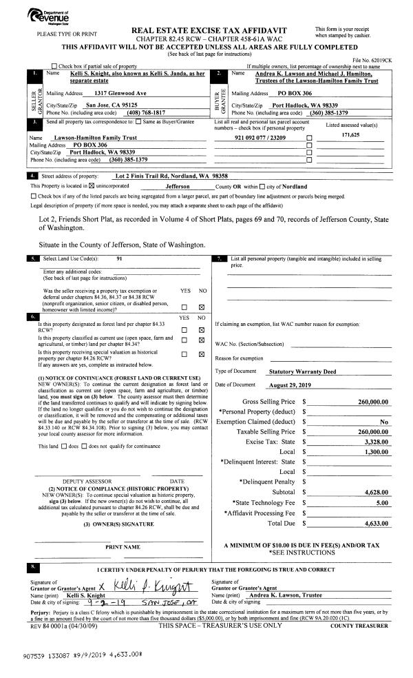 | Mailing Address: | ANDREA K LAWSON TRUSTEE MICHAEL J HAMILTON TRUSTEE PO BOX 53 NORDLAND, WA 98358-0053 | % Ownership: | 100.0000000000% |