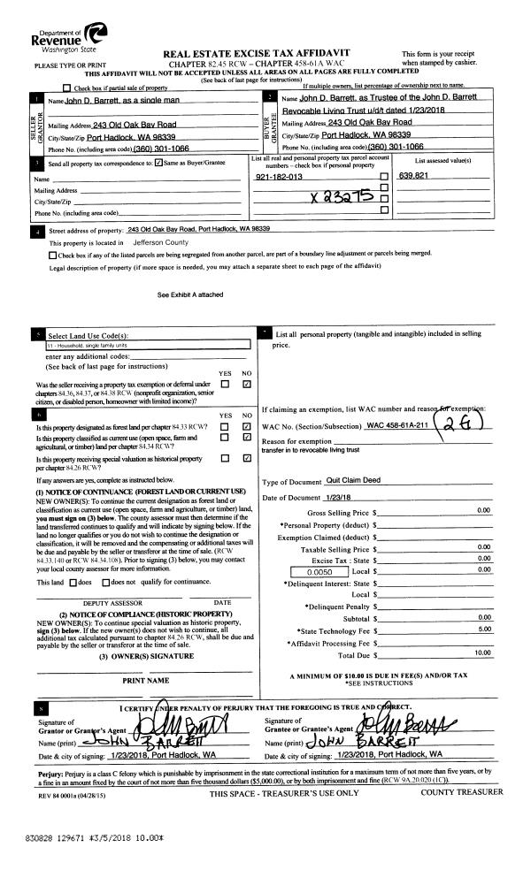 | 1 | 01/23/2018 | QCD | Quit Claim Deed | JOHN BARRETT | JOHN BARRETT REVOCABLE LIVING TRUST | | | | 129671 | |