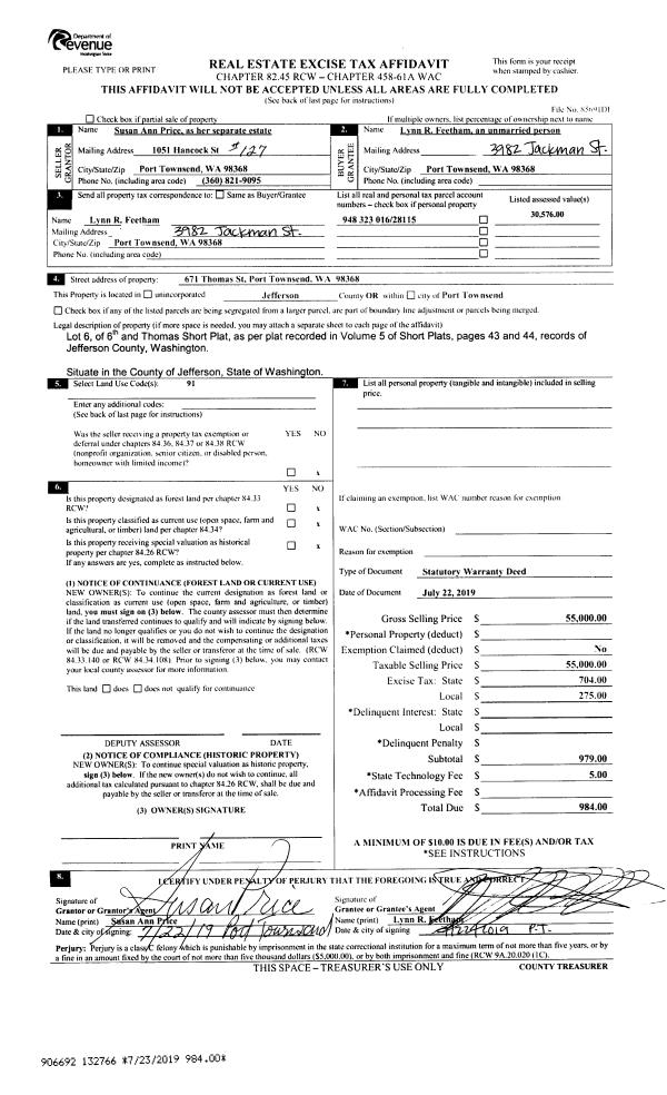 | 1 | 07/24/2019 | SWD | Statutory Warranty Deed | ERIC D LEE TRUSTEE | TERRI ROSS SURVIVORS TRUST | | | $275,000.00 | 132808 | |