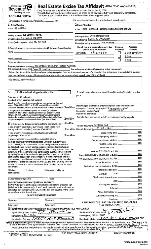 | 1 | 02/13/2025 | QCD | Quit Claim Deed | TIM B REIBER | TIM B & TASHEENA REIBER | | | | 144354 | |