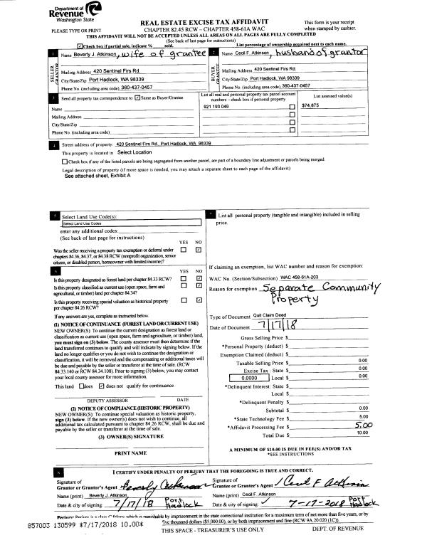 | Mailing Address: | JUSTIN E TAYLOR SARA TAYLOR 472 SENTINEL FIRS RD PORT HADLOCK, WA 98339-9736 | % Ownership: | 100.0000000000% |