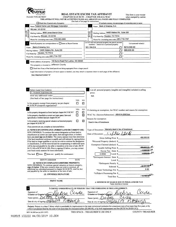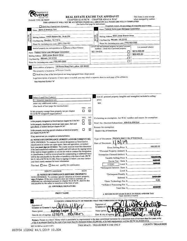 | 4 | 12/26/2018 | DILF | Deed in Lieu of Foreclosure | FEDERAL HOME LOAN MTG CORP | BANK OF AMERICA | | | $458,500.00 | 132222 | |