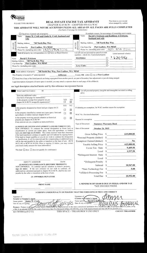 | 2 | 10/26/2015 | SWD | Statutory Warranty Deed | JAMES & LINDA CROFT | DAVID G & KATHLEEN A ERICKSON | | | $615,000.00 | 124271 | |