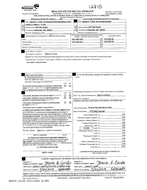 | 1 | 09/20/2018 | PRD | Personal Representatives Deed | JEFFREY J CURTIS | JANICE E CURTIS | | | | 131103 | |