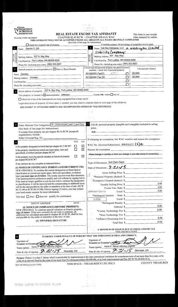 | 5 | 09/21/2015 | QCD | Quit Claim Deed | SANDRA D GITT | OAK BAY HIDEAWAY LLC | | | | 124038 | |