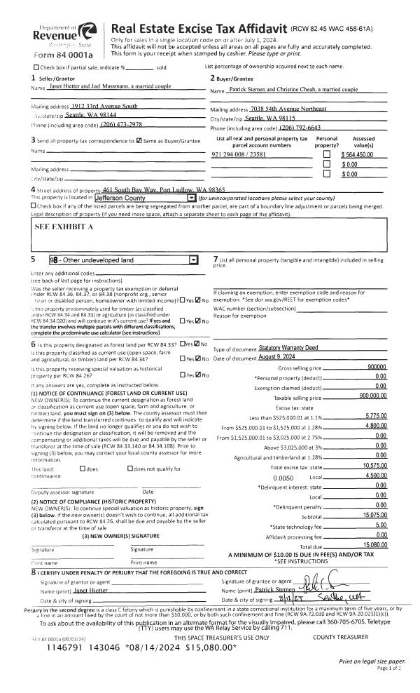 | 1 | 08/09/2024 | SWD | Statutory Warranty Deed | JANET HIETTER & JOEL MASSMANN | PATRICK STEMEN | | | $900,000.00 | 143046 | |