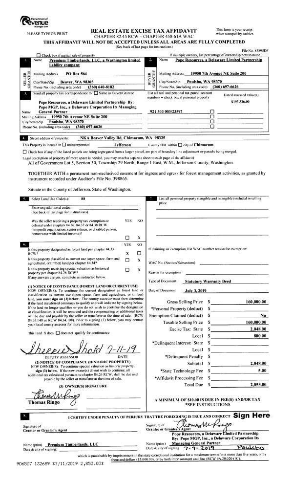 | 1 | 07/03/2019 | SWD | Statutory Warranty Deed | PREMIUM TIMBERLANDS LLC | POPE RESOURCES | | | $160,000.00 | 132689 | |