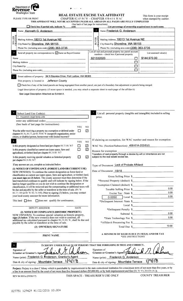 | 2 | 01/09/2018 | LOP | Lack of Probate | KENNETH G ANDERSON | FREDERICK G ANDERSON | | | | 129429 | |