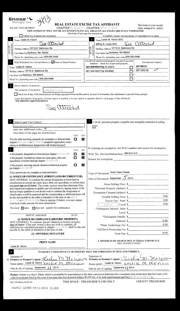 | 2 | 10/08/2014 | QCD | Quit Claim Deed | GEORGE A LUCAS TRUSTEE | LESLIE M HERION | | | | 122145 | |