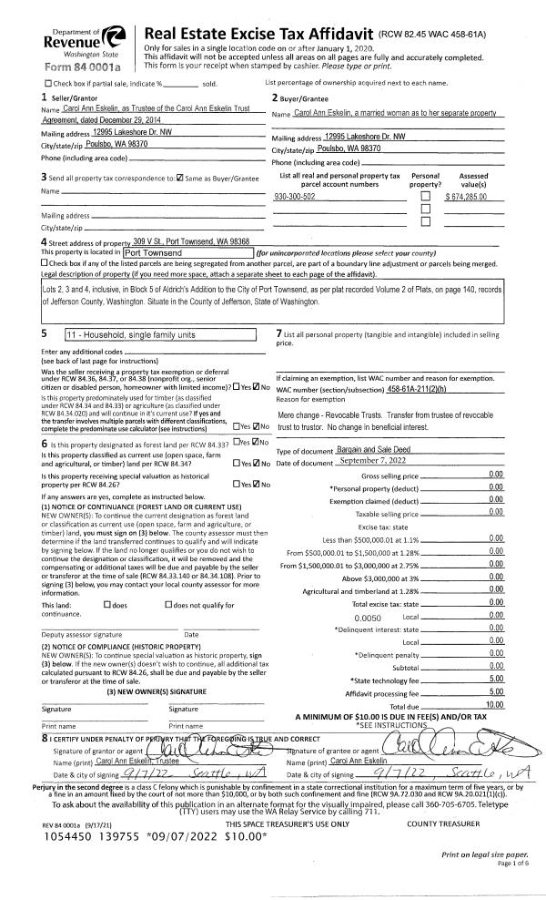 | 2 | 09/07/2022 | BSD | Bargain and Sale Deed | CAROL ANN ESKELIN TRUST | CAROL ANN ESKELIN | | | | 139755 | |