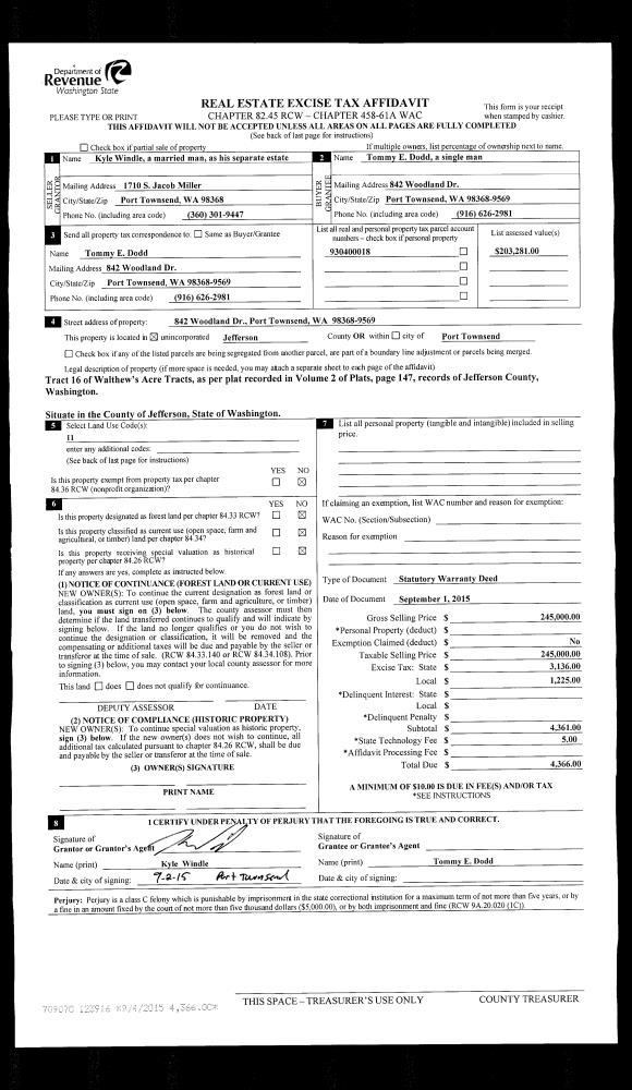 | 2 | 09/01/2015 | SWD | Statutory Warranty Deed | KYLE T WINDLE | TOMMY E DODD | | | $245,000.00 | 123916 | |