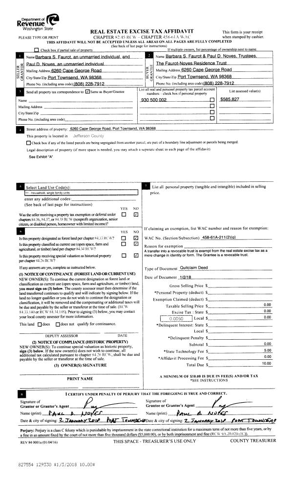 | Mailing Address: | BARBARA S FAUROT TRUSTEE PAUL D NOYES TRUSTEE 6260 CAPE GEORGE RD PORT TOWNSEND, WA 98368-9040 | % Ownership: | 100.0000000000% |