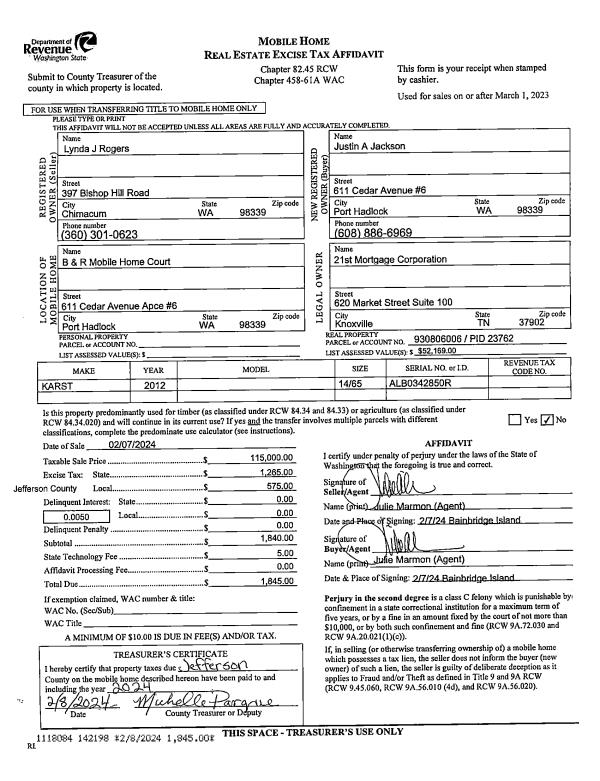 | 1 | 02/08/2024 | MH | Mobile Home | LYNDA J ROGERS | JUSTIN A JACKSON | | | $115,000.00 | 142198 | |