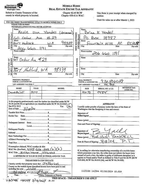 | 2 | 03/18/2024 | MH | Mobile Home | KEVIN JON YANDELL | BRIAN K YANDELL | | | | 142344 | |