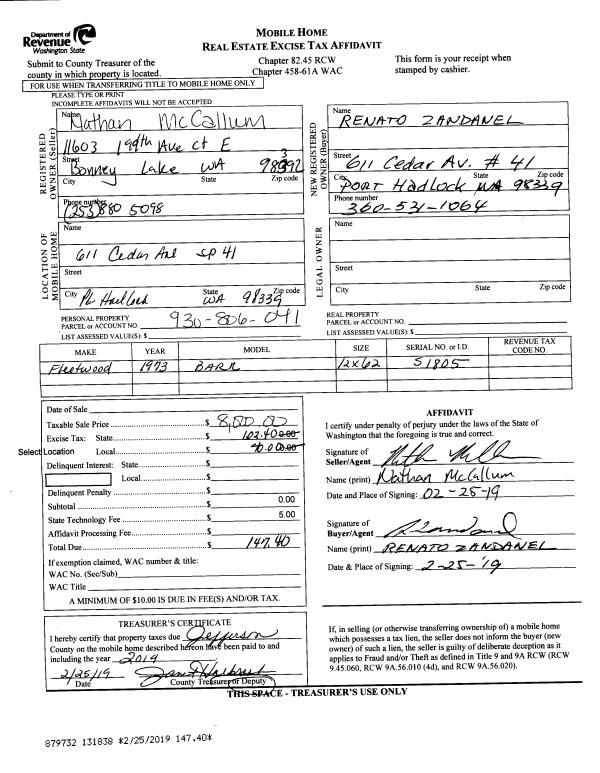 | 1 | 02/25/2019 | MH | Mobile Home | NATHAN MCCALLUM | RENATO ZANDANEL | | | $8,000.00 | 131838 | |