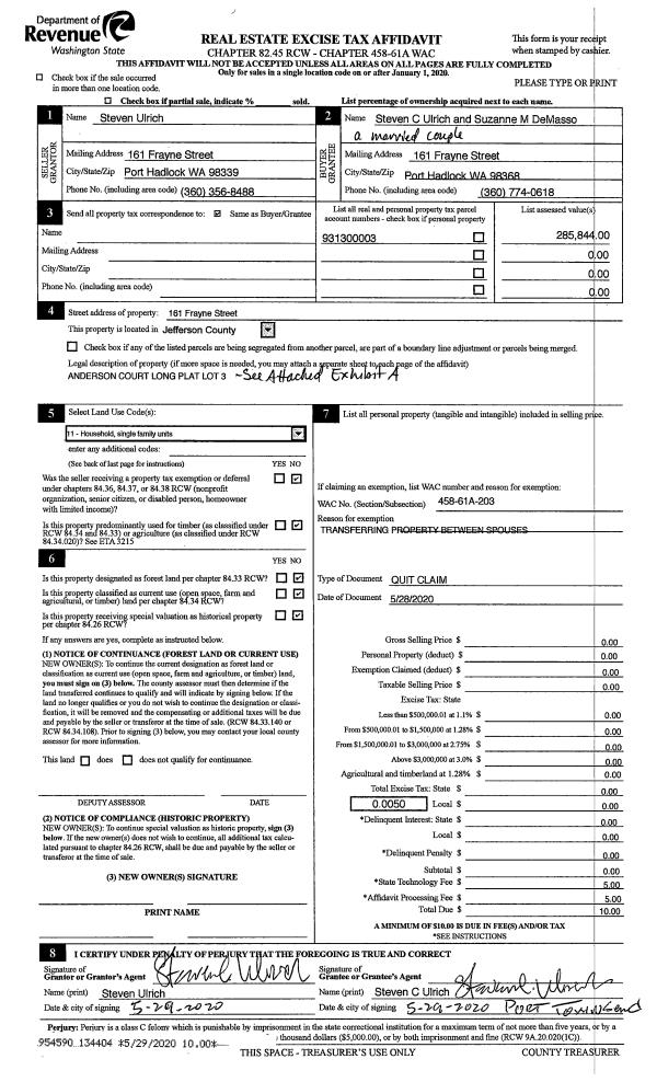 | 2 | 05/19/2015 | QCD | Quit Claim Deed | STEVEN ULRICH TRSTEE | STEVEN ULRICH | | | | 123240 | |