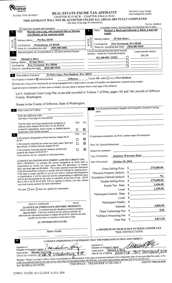 | 1 | 10/25/2018 | SWD | Statutory Warranty Deed | MARSHA A LONG | MICHAEL J & DEBORAH J BURK | | | $270,000.00 | 131328 | |