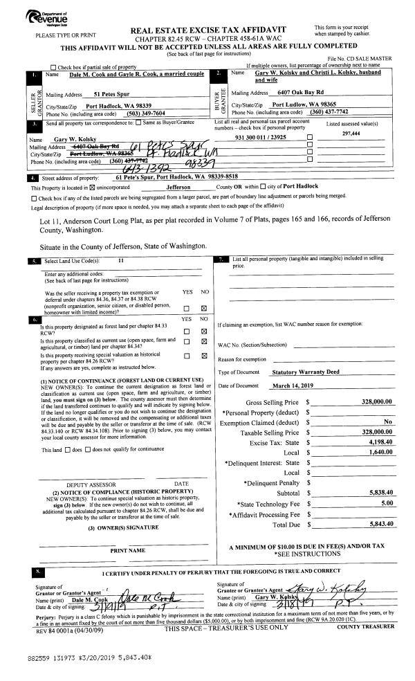 | 1 | 03/14/2019 | SWD | Statutory Warranty Deed | DALE M & GAYLE R COOK | GARY & CHRISTI KOLSKY | | | $328,000.00 | 131973 | |