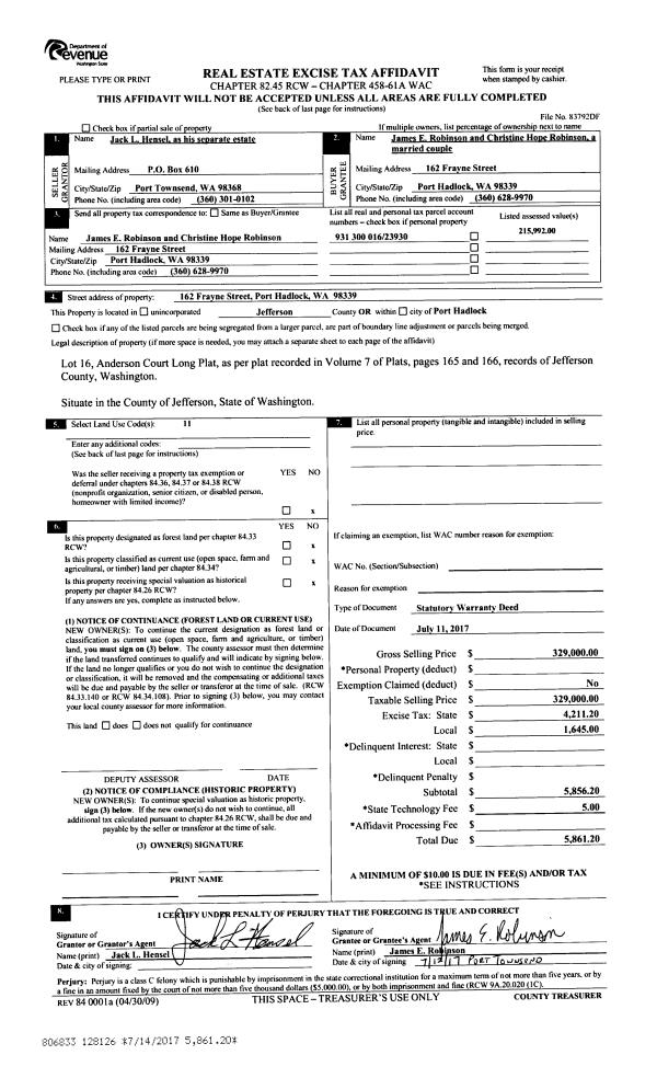 | 1 | 07/11/2017 | SWD | Statutory Warranty Deed | JACK L HENSEL | JAMES & CHRISTINE ROBINSON | | | $329,000.00 | 128126 | |