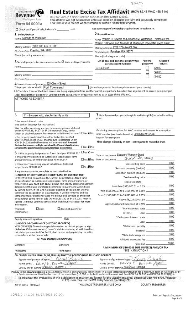 | 1 | 06/20/2023 | SWD | Statutory Warranty Deed | ALISANDE WATTERSON | WILLIAM D BOWERS & ALISANDE M WATTERSON REVOCABLE LIVING TRUST | | | | 141100 | |