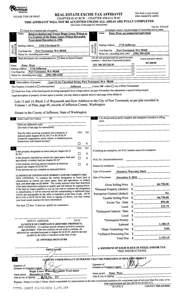 | 1 | 12/09/2016 | SWD | Statutory Warranty Deed | ROGER L WILSON TRUSTEE | PETER ANDREW WEST | | | $66,750.00 | 126815 | |