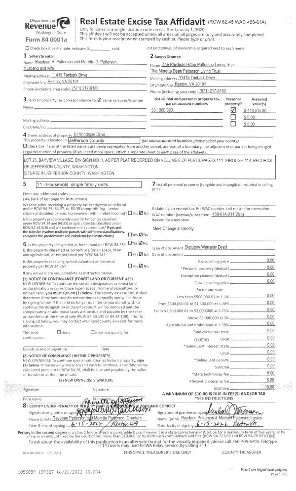 | 1 | 06/21/2022 | SWD | Statutory Warranty Deed | RAYDEAN H PATTERSON | RAYDEAN HILTON PATTERSON LIVING TRUST | | | | 139327 | |