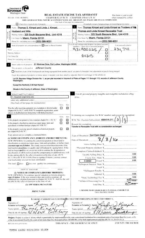 | Mailing Address: | THOMAS KIMPEL TRUSTEE LINDA KIMPEL TRUSTEE 81 WINDROSE DR PORT LUDLOW, WA 98365-9799 | % Ownership: | 100.0000000000% |