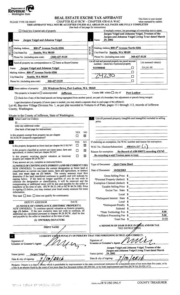 | 3 | 10/20/2003 | QCD | Quit Claim Deed | VEIGEL, JURGEN | VEIGEL LIVING TRUST | 0 | 0 | $0.00 | 98572 | 0 |