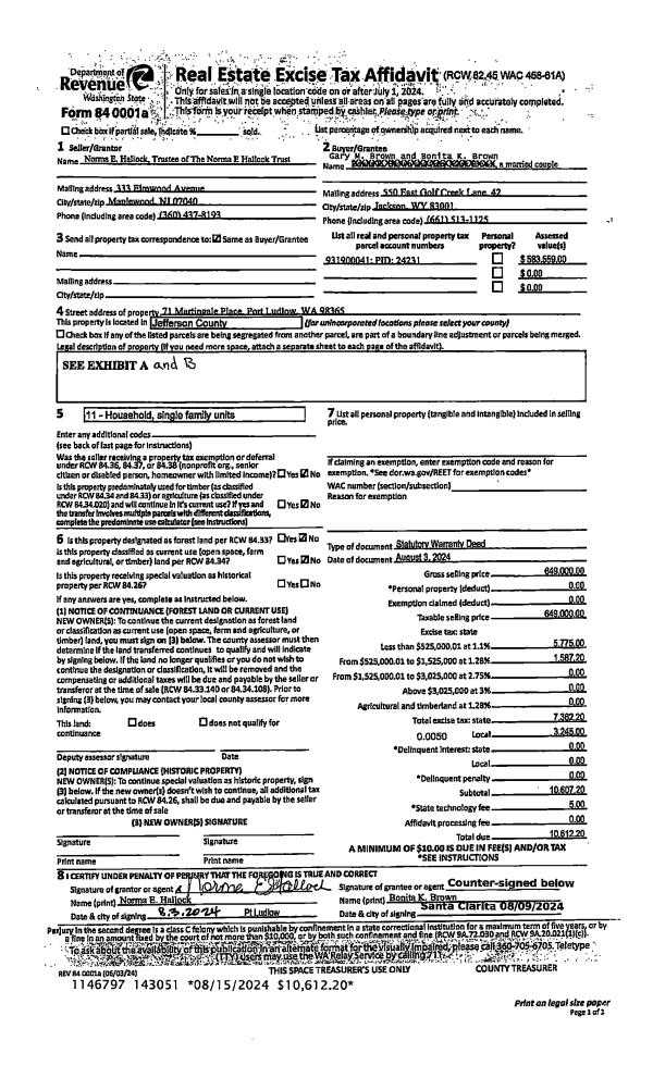 | 1 | 08/03/2024 | SWD | Statutory Warranty Deed | NORMA E HALLOCK TRUSTEE | GARY M & BONITA K BROWN | | | $649,000.00 | 143051 | |