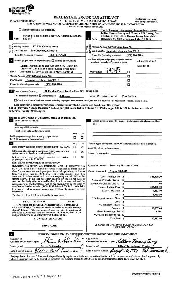| 2 | 08/28/2017 | SWD | Statutory Warranty Deed | STEVEN B SHANKLIN | LILLIAN THERESE LEUNG TRUST | | | $583,000.00 | 128456 | |