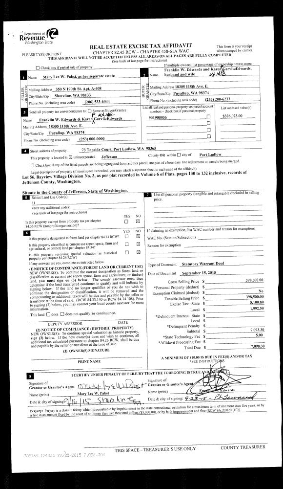 | 2 | 09/15/2015 | SWD | Statutory Warranty Deed | MARY LEE W PABST | FRANKLIN W & KAREN G EDWARDS | | | $398,500.00 | 124033 | |