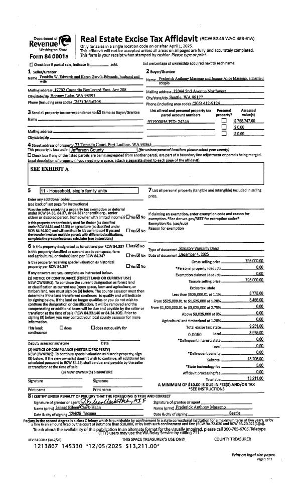 | 1 | 12/04/2025 | SWD | Statutory Warranty Deed | FRANKLIN W & KAREN G EDWARDS | FREDERICK A & JOANNE A MASSENO | | | $795,000.00 | 145330 | |