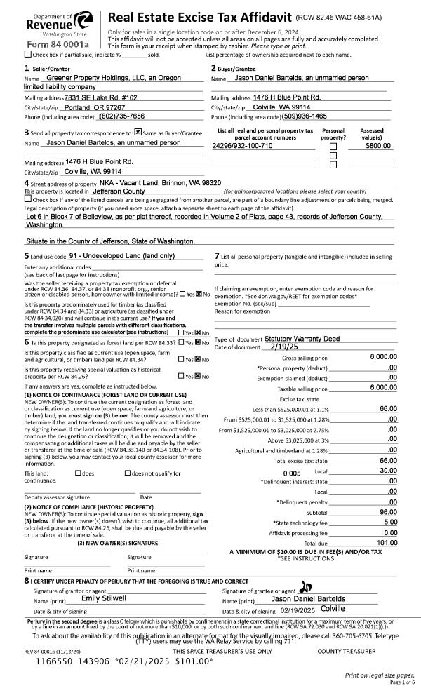 | 1 | 02/19/2025 | SWD | Statutory Warranty Deed | GREENER PROPERTY HOLDINGS LLC | JASON D BARTELDS | | | $6,000.00 | 143906 | |