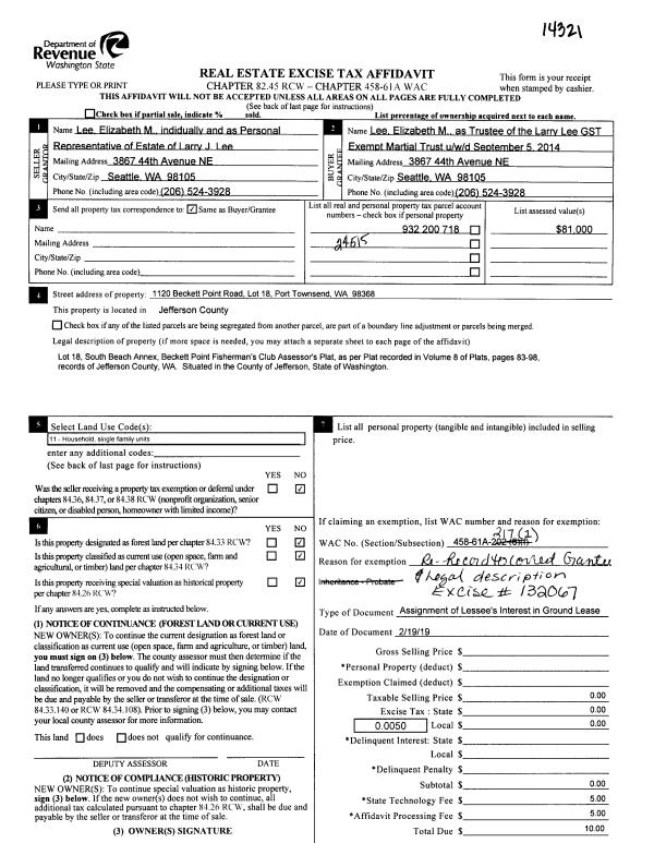 | Mailing Address: | ELIZABETH M LEE TRUSTEE 3867 44TH AVE NE SEATTLE, WA 98105-5448 | % Ownership: | 100.0000000000% |