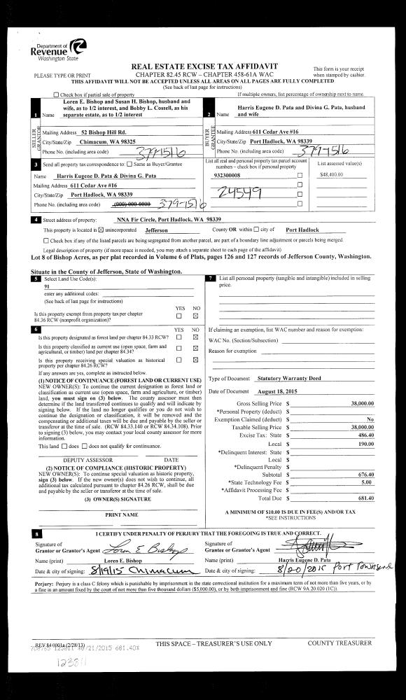| 1 | 08/18/2015 | SWD | Statutory Warranty Deed | LOREN E BISHOP | HARRIS EUGENE & DIVINA PATA | | | $38,000.00 | 123811 | |