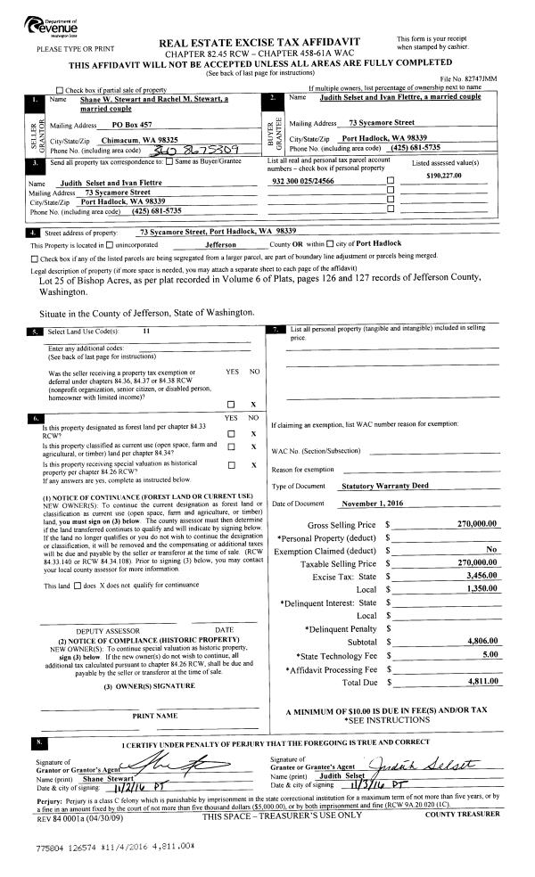 | 1 | 11/01/2016 | SWD | Statutory Warranty Deed | SHANE W STEWART | JUDITH SELSET & IVAN FLETTRE | | | $270,000.00 | 126574 | |