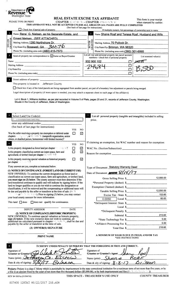 | 1 | 08/15/2017 | SWD | Statutory Warranty Deed | RENE' NIELSEN | SHANE & TERESA ROAF | | | $12,000.00 | 128363 | |