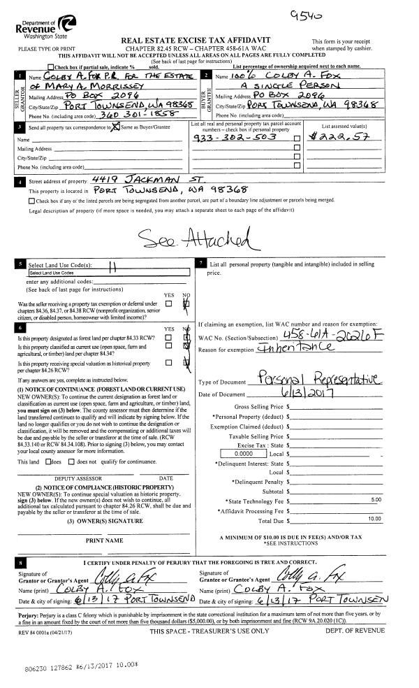 | 2 | 06/13/2017 | PRD | Personal Representatives Deed | MARY A MORRISSEY | COLBY A FOX | | | | 127862 | |