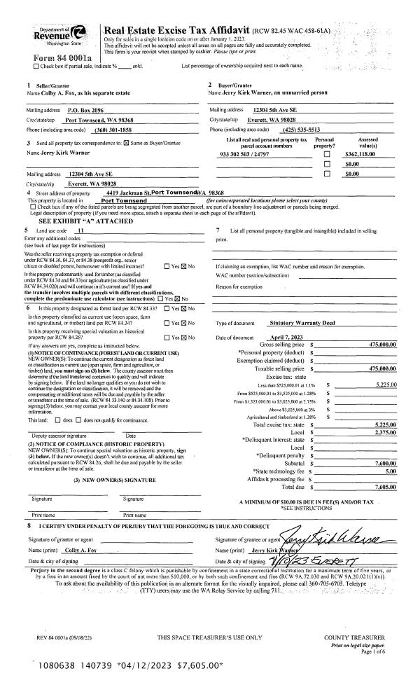 | 1 | 04/07/2023 | SWD | Statutory Warranty Deed | COLBY A FOX | JERRY K WARNER | | | $475,000.00 | 140739 | |