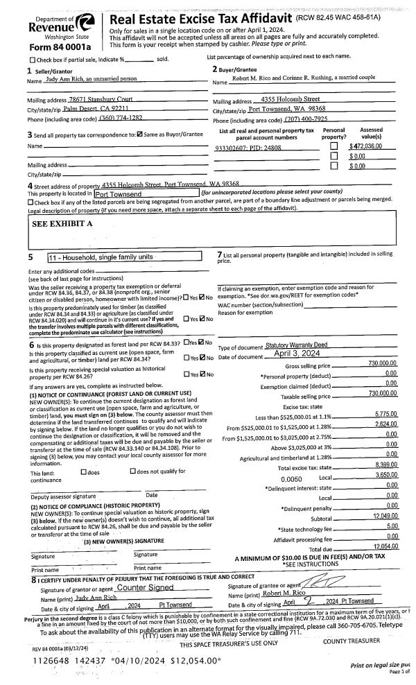| 1 | 04/03/2024 | SWD | Statutory Warranty Deed | WILLIAM R RICH | ROBERT M RICO | | | $730,000.00 | 142437 | |