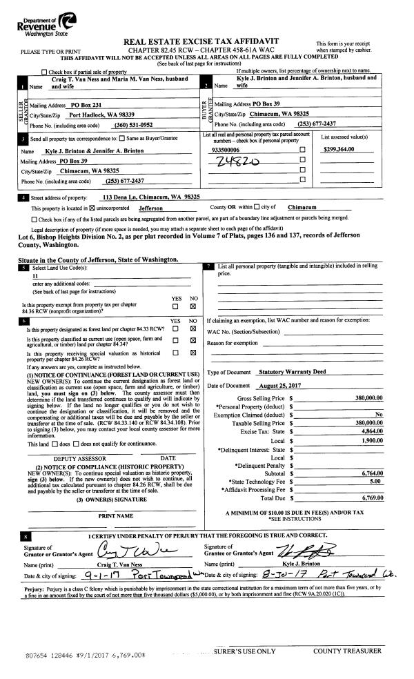 | 1 | 08/25/2017 | SWD | Statutory Warranty Deed | CRAIG VAN NESS | KYLE & JENNIFER BRINTON | | | $380,000.00 | 128446 | |