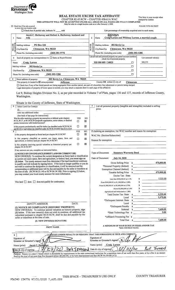 | 3 | 07/24/2020 | SWD | Statutory Warranty Deed | JACOB C HATHAWAY | CRAIG & WHITNEY LARSON | | | $475,000.00 | 134776 | |