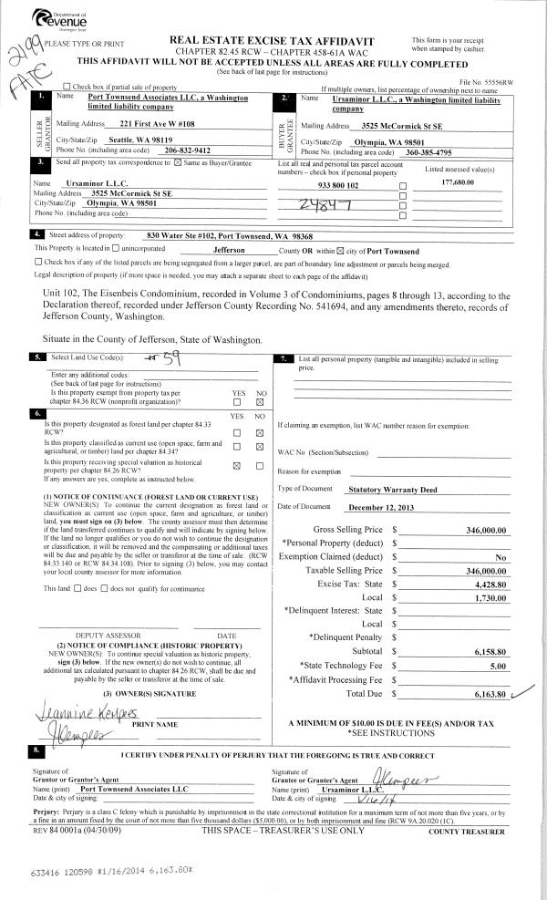 | 3 | 12/12/2013 | SWD | Statutory Warranty Deed | PORT TOWNSEND ASSOCIATES | URSAMINOR LLC | | | $346,000.00 | 120598 | |