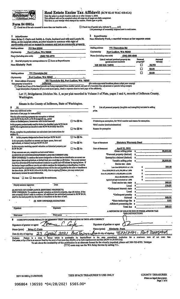 | 1 | 04/21/2021 | SWD | Statutory Warranty Deed | BRIAN C COYLE | KIMBERLY FUNK | | | $35,000.00 | 136593 | |