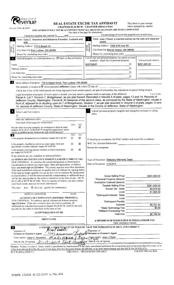 | 2 | 02/18/2019 | SWD | Statutory Warranty Deed | GARY C KNOWLTON | JOAN I FLOOD | | | $381,000.00 | 131828 | |