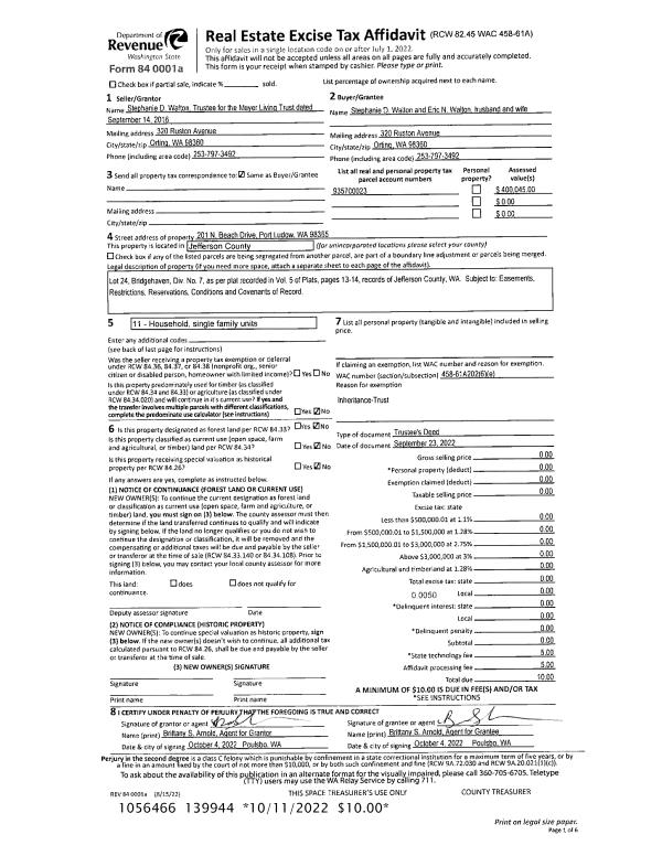 | 1 | 09/23/2022 | TRED | Trustee Deed | MEYER LIVING TRUST | STEPHANIE D & ERIC N WALTON | | | | 139944 | |