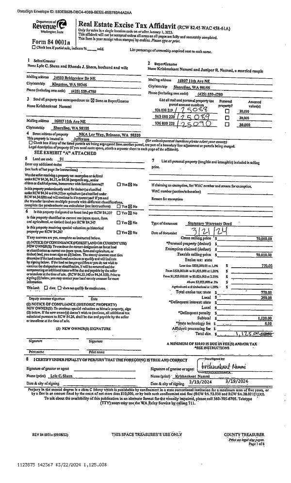 | 1 | 03/21/2024 | SWD | Statutory Warranty Deed | LYLE C SHEEN | KRISHNAKANT & JUNIPER NAMMI | | | $70,000.00 | 142367 | |