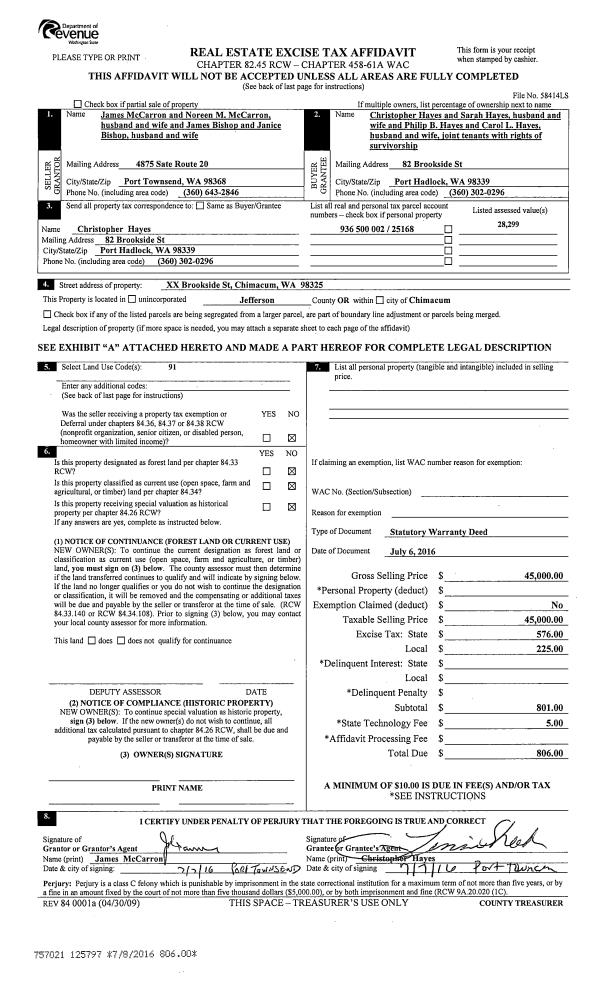 | 2 | 07/06/2016 | SWD | Statutory Warranty Deed | JAMES & NORINE MC CARRON | CHRISTOPHER & SARAH HAYES | | | $45,000.00 | 125797 | |